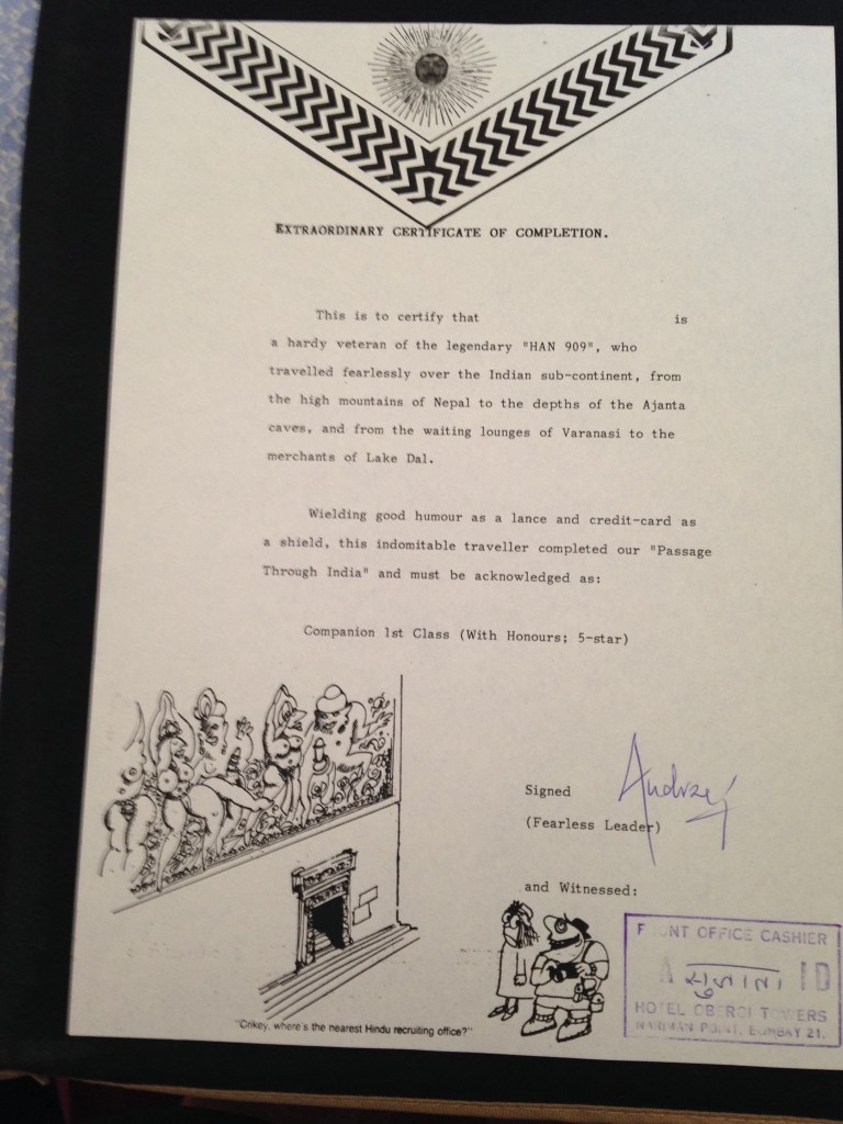 A great highlight of the tour was the visit to Kashmir and Lake Dal with its floating gardens.We saw Shalimarand stayed on the Deluxe Houseboats which we reached by slim “shikara” lake boats.More elephants in Jaipur for the trip up to the Amber fortress-palace and, when reaching Udaipur the lunch promised by the Lake Palace Hotel.The final stages of our memorable journey included Aurengabad, for the famous rock-cut monasteries and temples of Ellora as well as the great caves at Ajanta before our flight to Bombay.In the course of an informal farewell evening we discussed how much we had rescued from a disastrous situation.With good humor we awarded ourselves with an Extraordinary Certificate of Completion, witnessed by the Oberoi Hotel Front Office cashier.